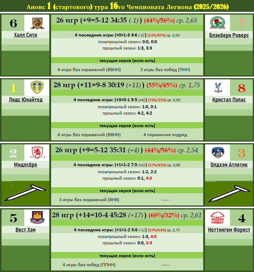 Лидс (10/-10) 0 (-2,2) --- Халл (12/1) 13 (-0,9) 0:0 (FT) (0:0, 0:0) Лидс (1-4-4-3) Алиссон -2 - Ван Дейк 5, Шер 3, Тимбер 2, Митчелл 2 - Де Брюйне -2, Эзе 1, Семеньо (к) -2, Мбеумо -2 - Педро -3, Вуд -2 Халл (1-3-5-2) Аррисабалага -3 – Гехи (к) 2, Килман 0, Айна 5 – Троссард -1, Боуэн -2, Клюйверт -2, Висса -2, Доку 5 – Фергюсон -3, Уилсон 1 Запасные: Селс (в) 8, Гюндоган (п) 5, Уортон (п) 0