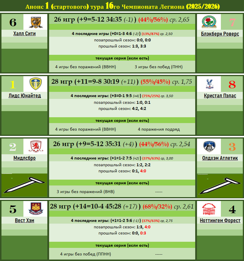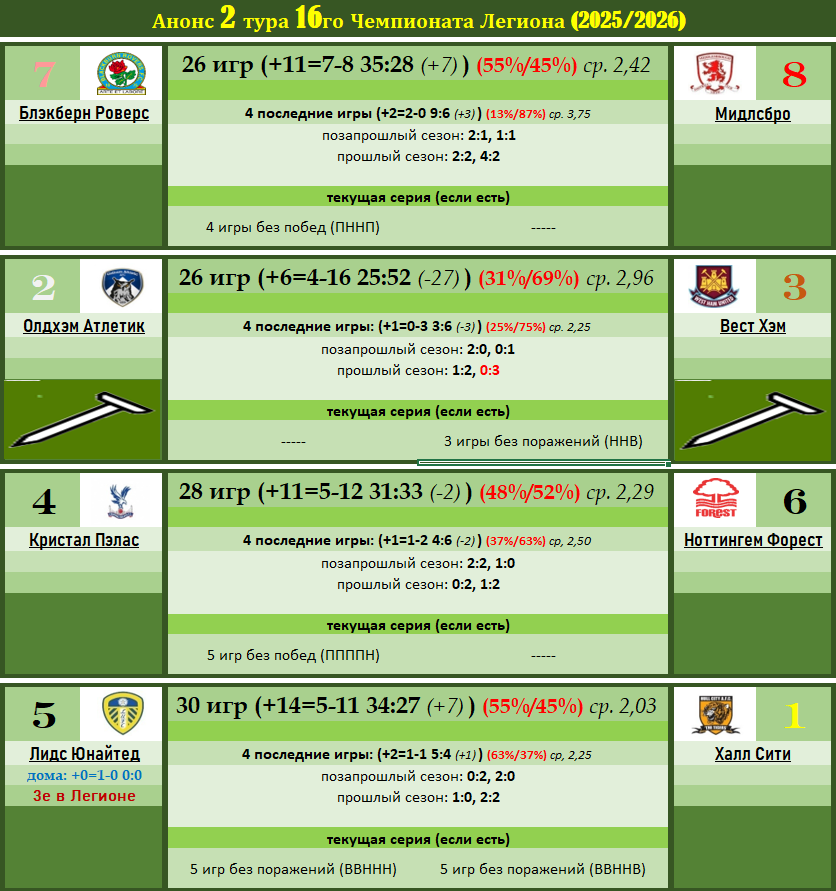 Live-таблица чемпионата 1(2)Олдхэм А +2=0-0 5:1(+4)6() 2(5)Лидс Юн +1=1-0 2:0(+2)4() 3(4)Кристал П +1=1-0 1:0(+1)4() 4(1)Халл Сити +1=0-1 2:2(=0)3() 5(3)Вест Хэм +1=0-1 3:4(-1)3() 6(7)Мидлсбро +0=1-1 0:2(-2)1() 7(7)Блэкберн +0=1-1 0:2(-2)1() 8(6)Ноттингем +0=0-2 1:3(-2)0()