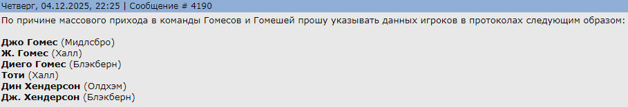 | Да, составы являются единственным источником достоверной информации при публикации протоколов. В них Тоти указан именно как Тоти, а не как Тутси или Тотси. Нравится, и отлично. Тоти во многих источниках именно так и указан - просто Тоти. Как и приведенный тобой в пример бразил Эстевао. Именно поэтому я не был против, чтобы его так указывали в протоколах (конкретизировал в миксте), за что теперь парадоксальным образом расплачиваюсь. Я именно так и поступлю - оставлю в протоколах просто Тоти и Эстевао. По Нико Гонсалесу я не согласен - здесь для меня явно видны имя и фамилия. Это все равно что Николая Селиванова писать в протоколах как Коля. Пункт 5.5 Правил гласит, что написание фамилий игроков определяется организатором по своему усмотрению. Так что, в определенных случаях я самостоятельно принимаю решение по отдельным игрокам, нравится это вам или нет. Прошу это учесть и не выносить мне больше мозг перед сном. Отчасти, именно по этой причине я уже давно ретировался с форума. Протоколы буду неустанно править и настаивать на публичной правке до тех пор, пока они не станут заполняться корректно. Опять же, нравится это вам или нет. Фабиу Силвы нет в АПЛ - он играет за Боруссию Дортмунд. По Джеймсу согласен - упустил из вида наличие Дэниэла из Лидса. Внес соответствующие правки. Буду в дальнейшем указывать с Р.